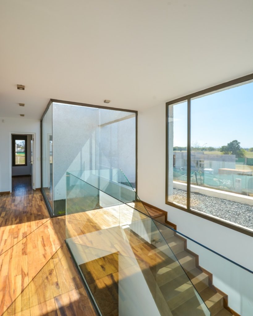 El orden de la planta se dispone en dos ejes perpendiculares, ubicando al patio interior en el cruce de los mismos. En el sentido del eje más corto, se ubican los accesos desde el exterior y salida al jardín, a través de una extensa galería. De esta manera al ingresar a la casa se impone dicho patio que se alza en doble altura acompañando el desarrollo de la escalera y a través del cual se puede apreciar el living – comedor, mientras en su interior crece un exótico árbol. En la planta alta, se diferencian dos zonas, por un lado, el sector de los hijos y por otro la suite a la que se accede a través de un puente que cruza la doble altura del comedor hacia un lado y la doble altura del patio hacia el otro.
